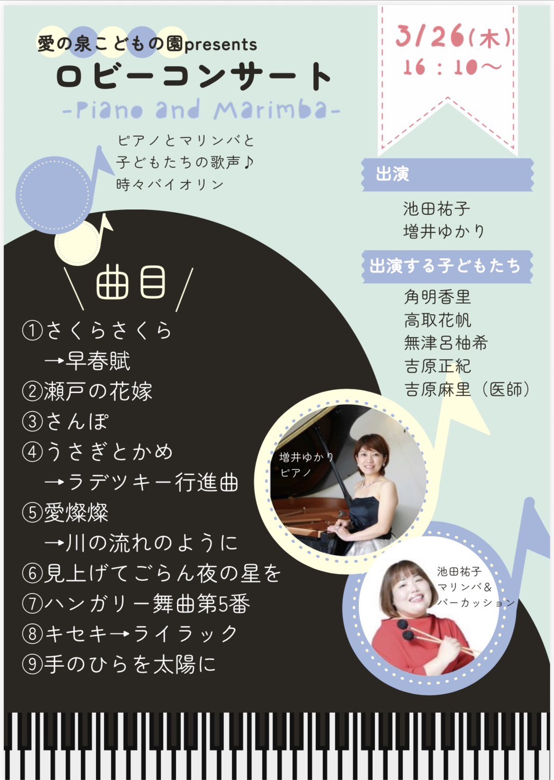 3月26日のロビーコンサートは愛の泉こどもの園の馬場道子先生からのプレゼントでした。マリンバの池田祐子さんとピアノの増井ゆかりさんと子ども達による演奏でした。途中で副理事長の吉原麻里もバイオリンで参加させていただき、楽しい時間でした。